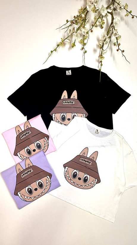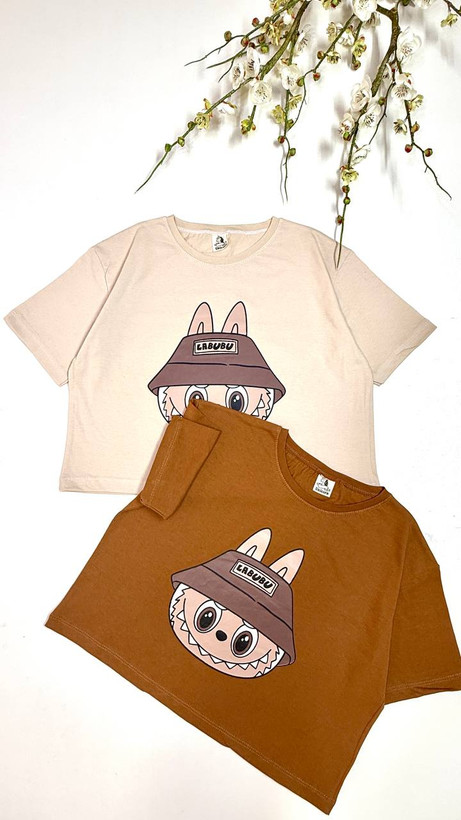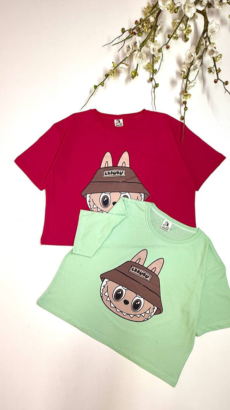 تیشرت کراپ نخ پنبه زنانه طرح لبوبو قواره بزرگ
